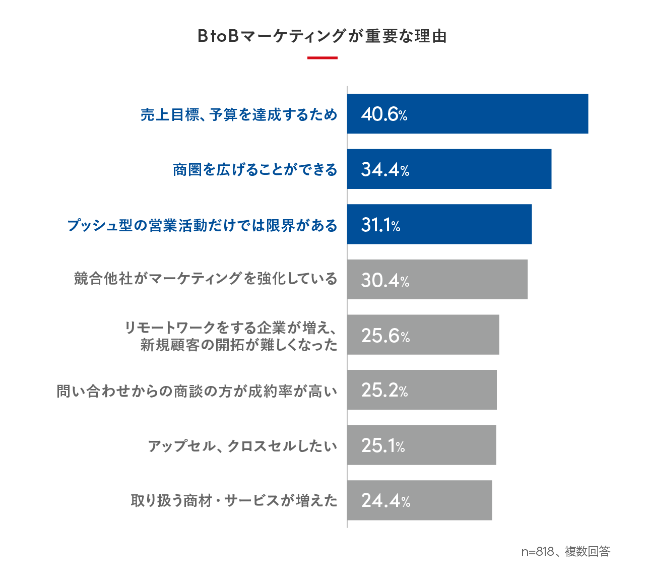 BtoBマーケティングが重要な理由の上位は「売上目標・予算の達成」「商圏を広げる」「プッシュ型の営業活動だけでは限界がある」。新たな売上拡大策として期待されている