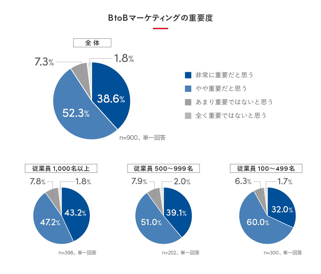 全体の9割以上が「BtoB事業でもマーケティングは重要」と回答。企業規模を問わず重視している
