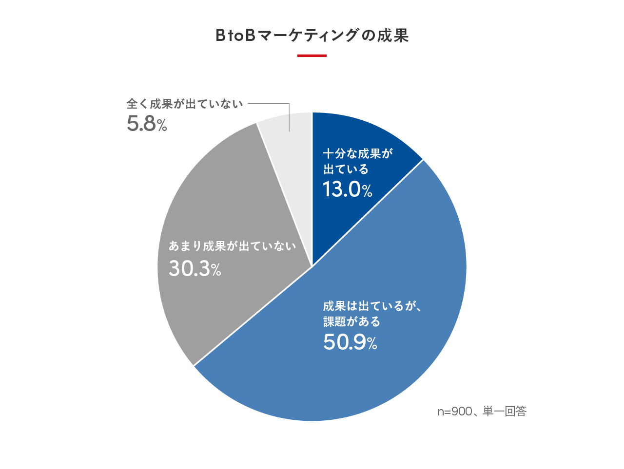 BtoBマーケティングの成果について「十分な成果が出ている」と答えたのはわずか13%で、8割以上が何らかの課題を抱えていることが分かりました。