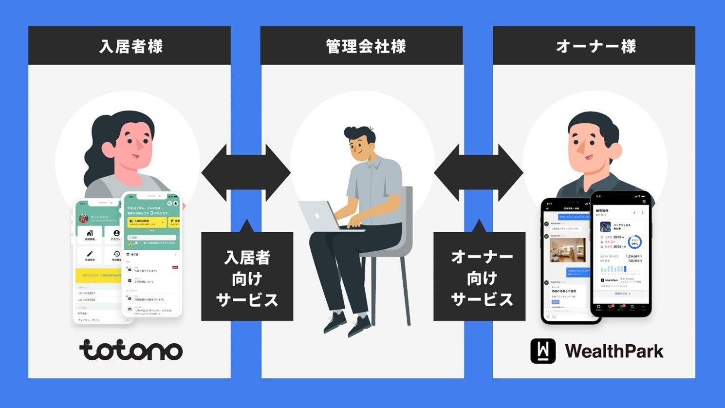2023年9月末までに「totono」と「WealthParkビジネス」の両サービスを新規でご導入いただく管理会社様向けに、お得なセットプランを提供いたします。入居者向けに特化した「totono」とオーナー向けに特化した「WealthParkビジネス」それぞれの強みを活かしたサービスをお使いいただきつつ、パッケージプランとしてご導入いただきやすい形でご提供いたします。