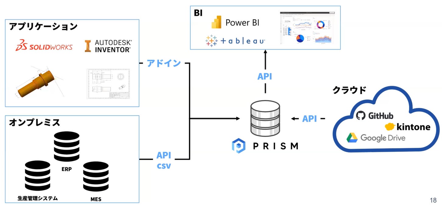 導入されて年月が経つシステムはソースコードがブラックボックス化され、システム間のデータ連携に高額な費用がかかります。そこで『PRISM』は豊富なAPIを備える事で外部システムと比較的低コストで接続できる基盤を提供しています。製造実績データを生産管理システムからPRISMにフィードバックしたり、設計BOMをERPに連携したりといったユースケースを想定しています。