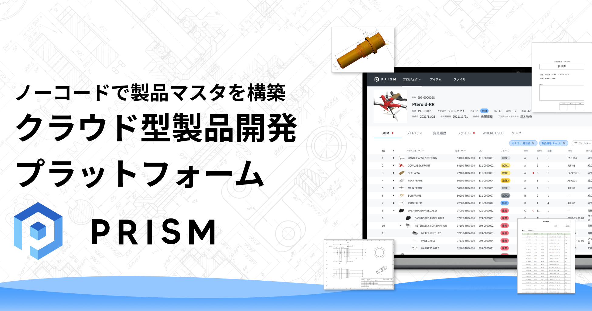 『PRISM』はノーコードで自社に合わせた部品データモデルを構築し、製品開発情報を一元管理するためのソリューションです。バージョンごとの部品表(Bill of Material)を土台に、各部品に対して図面、仕様、原価、在庫、調達データ、品質情報、製造情報などを紐付ける事で製品マスタを構築、製品開発における部門間の連携をスムーズにします。