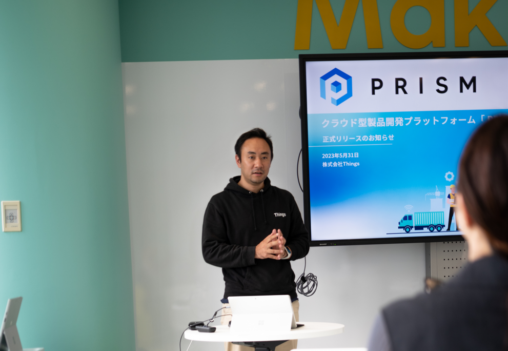 2023年5月31日に、六本木ヒルズ森タワーにて、『PRISM』の正式版提供開始に伴い、記者会見が行われました。当社の代表取締役CEO 鈴木敦也より、会社と提供サービスについての説明、動画によるデモンストレーション、『PRISM 』により期待される効果についての説明がなされました。