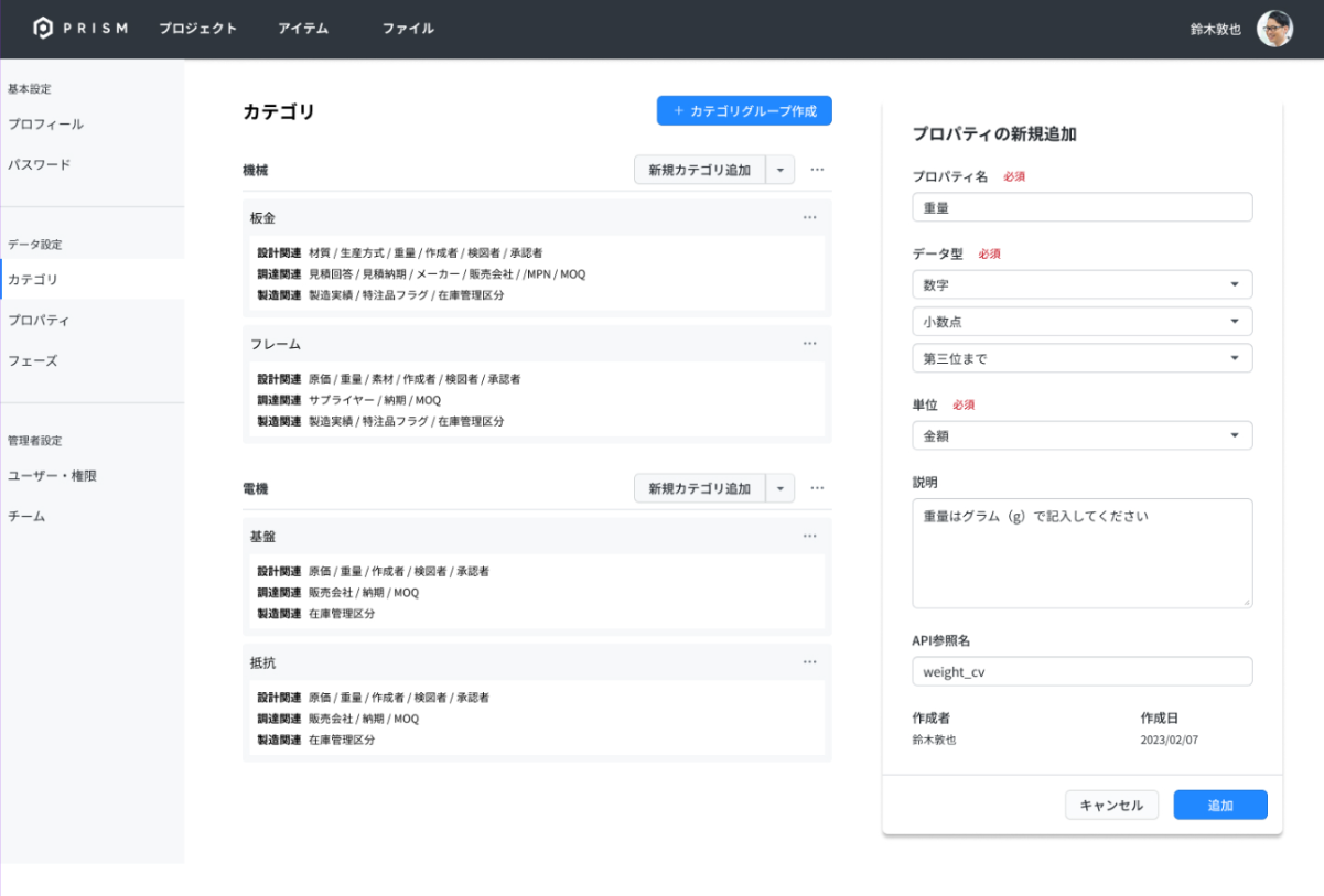 『PRISM』では豊富なカスタマイズ機能を備えています。企業ごとに違う設計フェーズや、部品ごとに異なる属性項目の設定が行えます。入力ミスを減らす「セレクト方式」のデータ型にも対応し、ユーザーが使いやすいシステムの構築が企業内で完結します。属性項目を追加する度にベンダーに開発依頼が無く、現場手動のデータ活用を促進します。