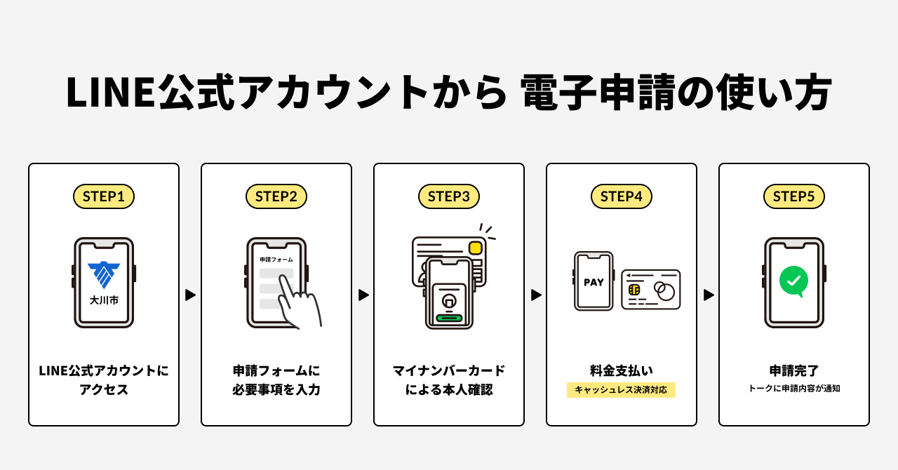 今回は“行かない役所・書かない役所”の実現に向けて、大川市が現在受け付けている全9種類の行政手続で「スマート公共ラボ電子申請」の運用を開始。LINE上でのマイナンバーカードによる公的個人認証に対応することで、別途アプリ等のダウンロードを必要とすることなく、LINE上の操作のみで申込から決済までの全ての申請手続きが可能になります。また、今までクレジットカードのみであった決済手段もQR決済・バーコード決済に対応、利用者のさらなる利便性向上を図ります。