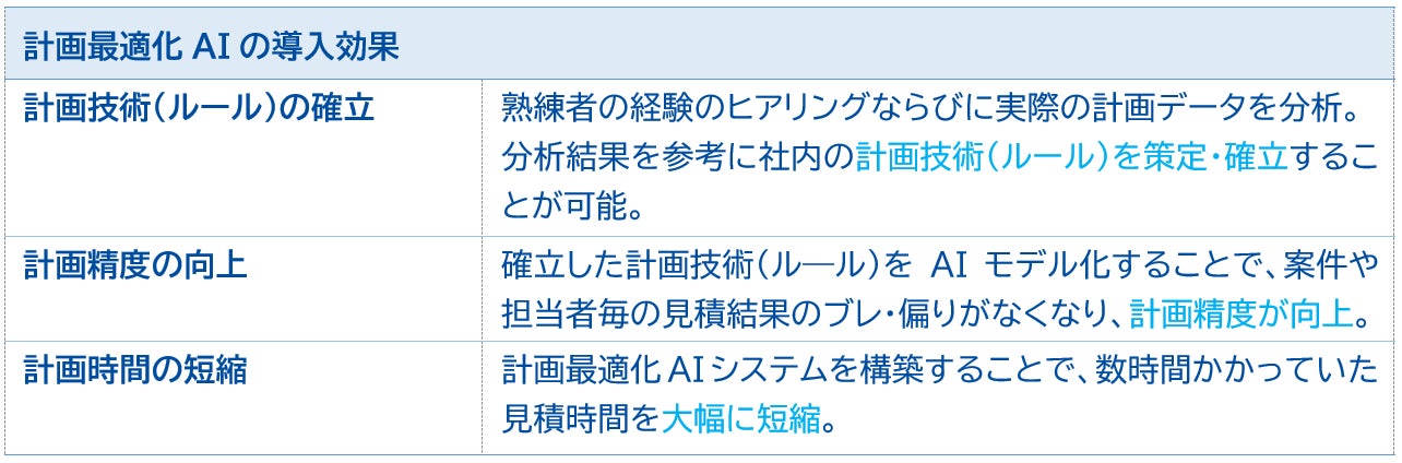 ニーズウェルは、これまで蓄積されていた実際の作業計画の作成手法をヒアリングし、複雑な配置ルールを可視化。実証実験を経て計画最適化のAIモデルを開発しました。