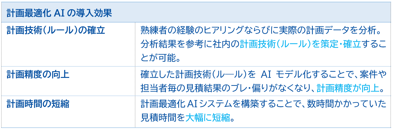 ニーズウェルは、これまで蓄積されていた実際の作業計画の作成手法をヒアリングし、複雑な配置ルールを可視化。実証実験を経て計画最適化のAIモデルを開発しました。