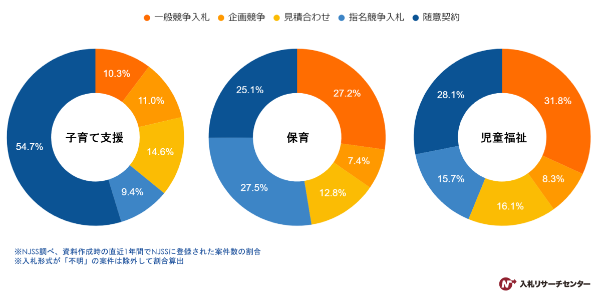 子育て支援においては、半数以上が”随意契約”による案件である一方で、保育・児童保育カテゴリでは約半数の案件が競争性を持つ公示となっています。