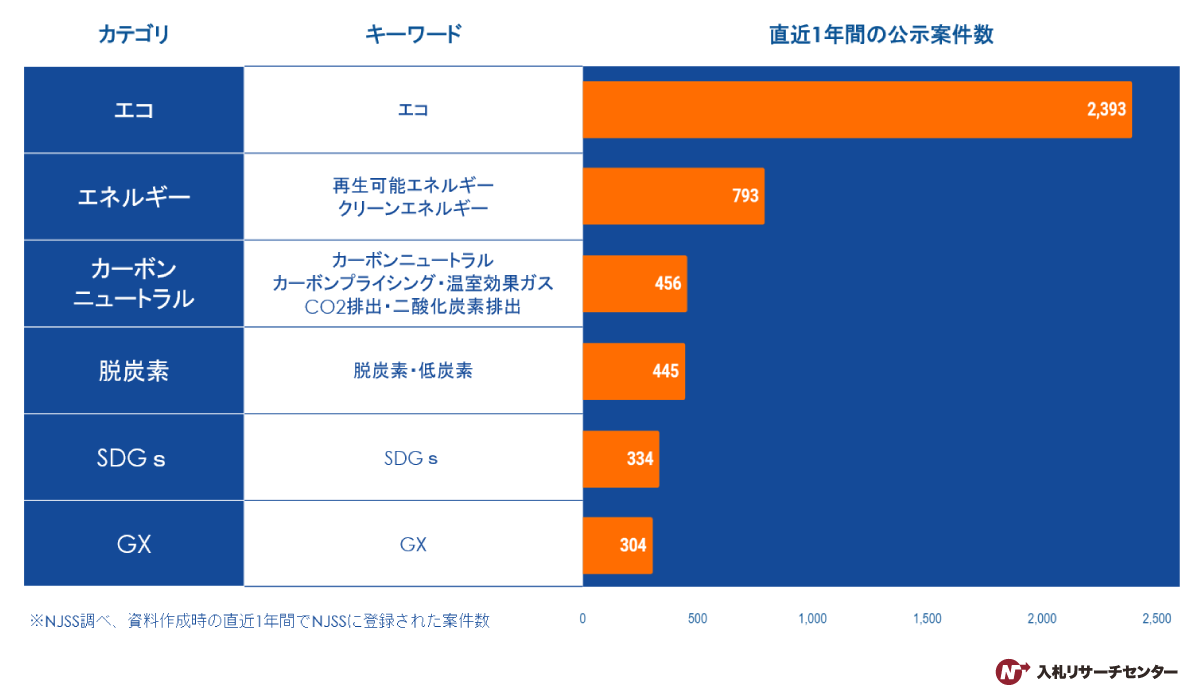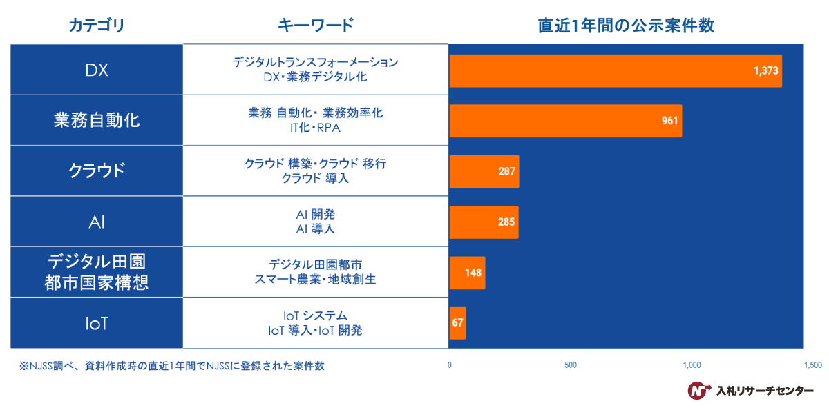これらの分野に関連するキーワードに基づいて公示されている入札案件を、入札情報速報サービス「NJSS」(https://www2.njss.info/)に登録されている案件情報から抽出し、入札リサーチセンターが調査・分析しました。