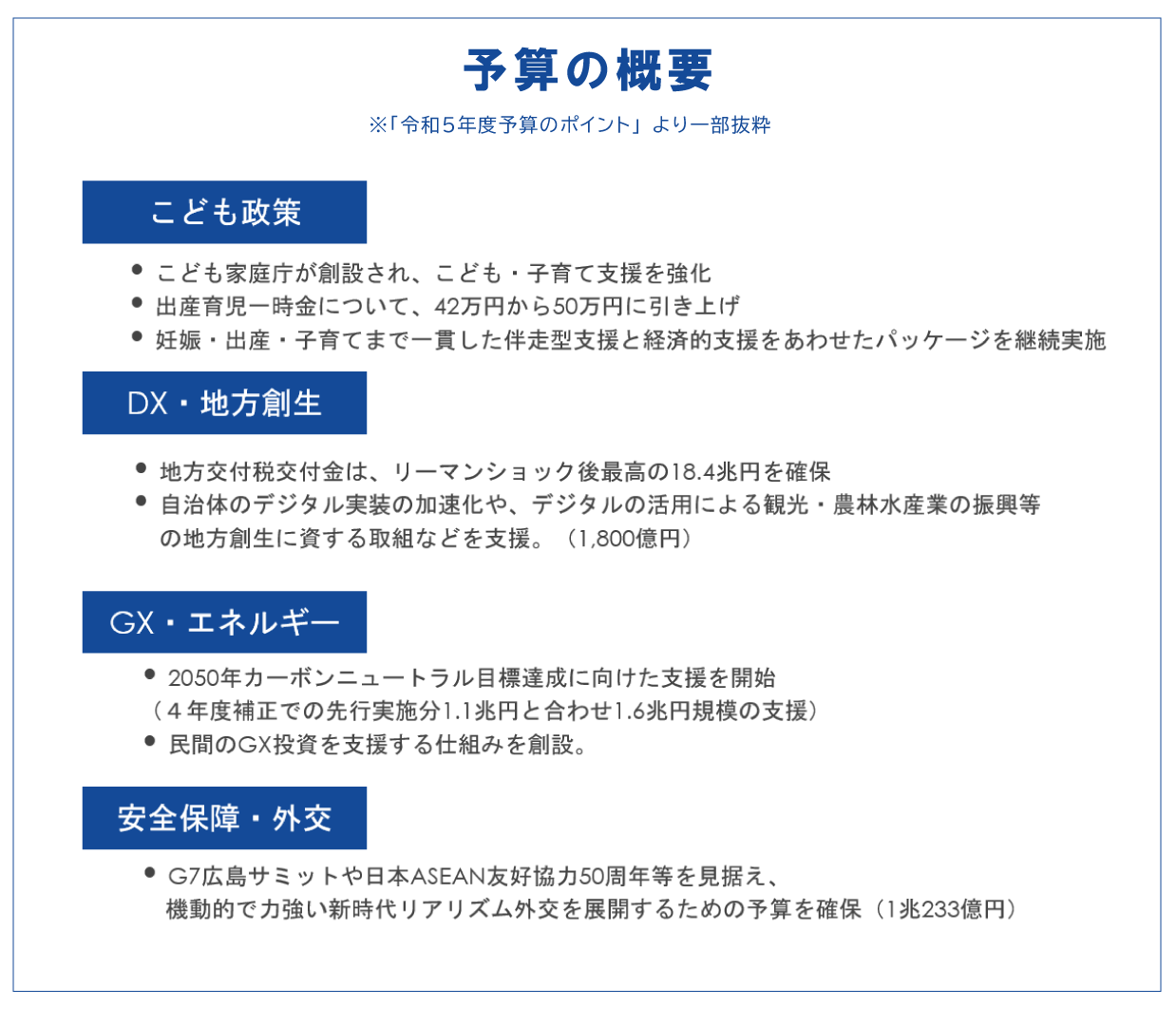 政府は令和5年度予算を、「歴史の転換期を迎える中で、国内外の重要課題に取り組み、未来を切り拓くための予算」と位置づけています。この予算は、我が国が直面する課題に対する解決策を見出し、持続的な発展を推進していくために注力される内容となっています。