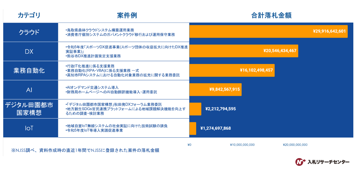 「クラウド」カテゴリの案件では、クラウドシステムの構築や運用保守など、大規模な案件が多く見られます。DX・地域創生の分野では、自治体によるDXの推進が背景となり、案件数や落札金額が年々増加しています。