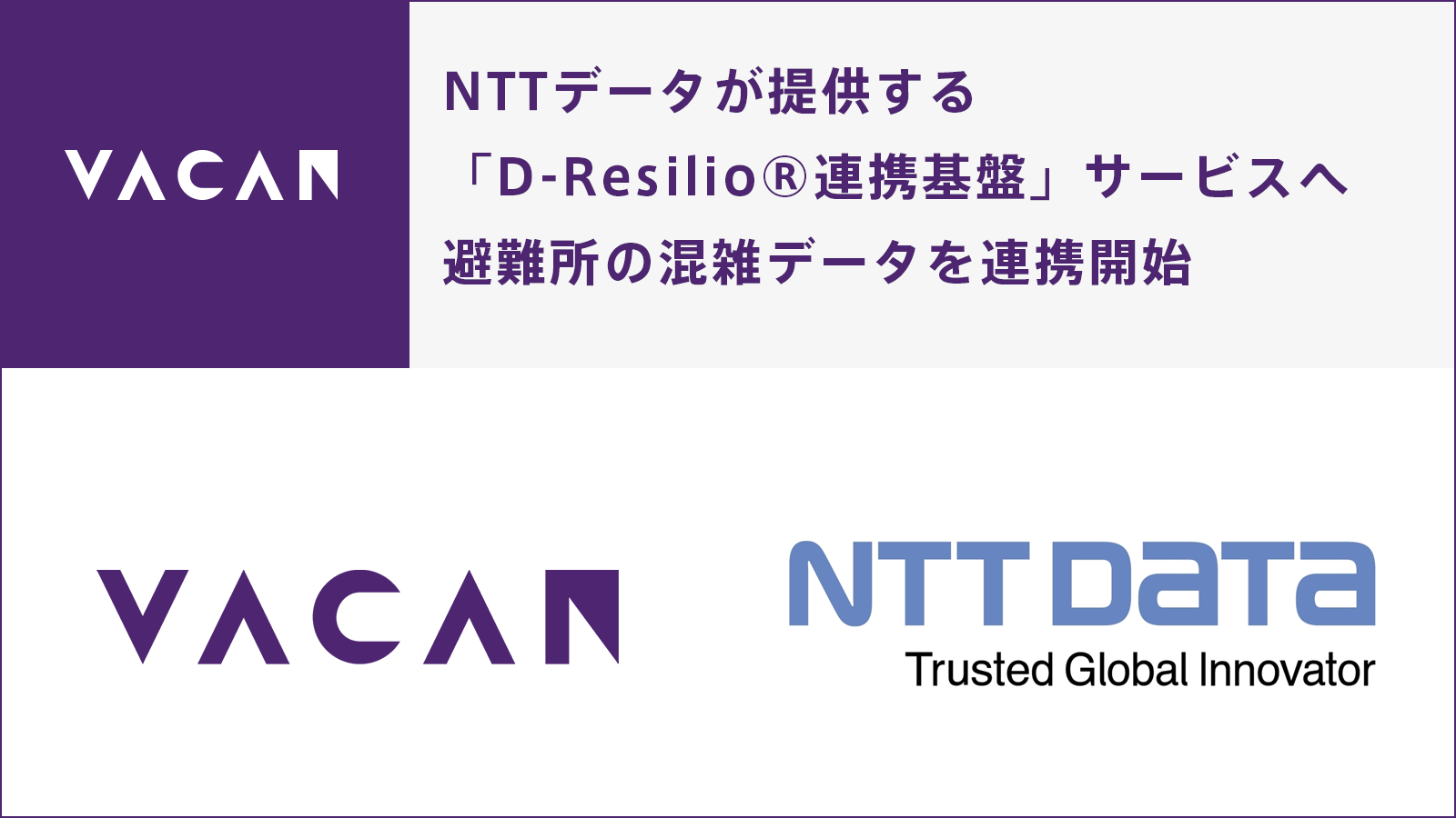 そこでNTTデータとバカンは、避難所情報をリアルタイムで一元管理し、迅速な避難をサポートの実現を目的として、「D-Resilio連携基盤」サービスに避難所の混雑データを連携する取り組みを開始します。これにより、避難所の情報提供を効率化し、適切な避難行動の促進を実現します。また、自治体も必要な支援をより効率的に提供することが可能となり、災害発生時に避難者がより安全に避難しやすい状況を作り出します。