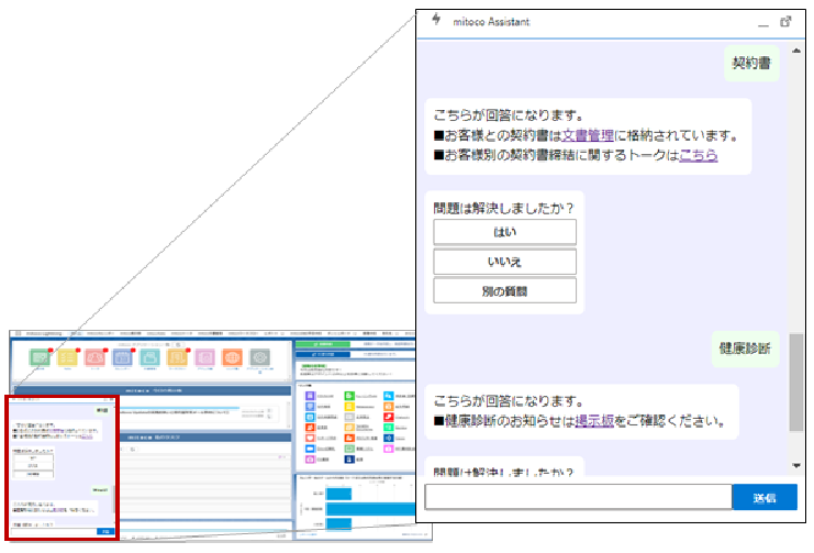 組織内の問い合わせ対応を自動化するチャットボット機能を持つ「mitocoアシスタント」。日本語の特殊性を理解して自然な会話を実現する国産人工知能が搭載され、登録されたQ&Aを単語単位でAIが理解し、最速かつ最適な回答を導き出します。社内のマニュアルや問い合わせ情報を一元化することが可能です。問い合わせ対応を自動化することで担当部署の業務効率化を促進するとともに、問い合わせ内容を分析することで、業務自体の見直しや改善につなげることもできます。2022年5月に正式にリリース。