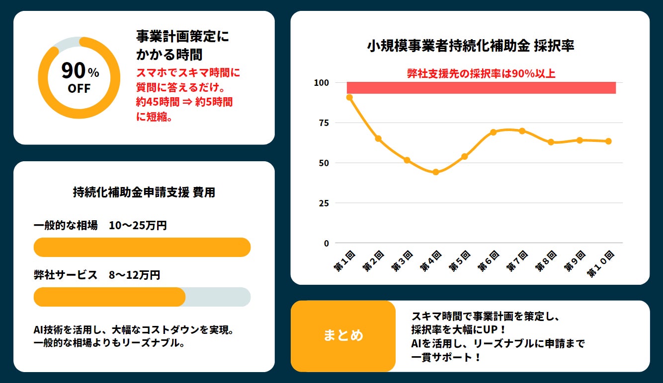 今まで補助金の申請に対して心理的・時間的なハードルのあった事業者様でもご利用しやすくなっております。