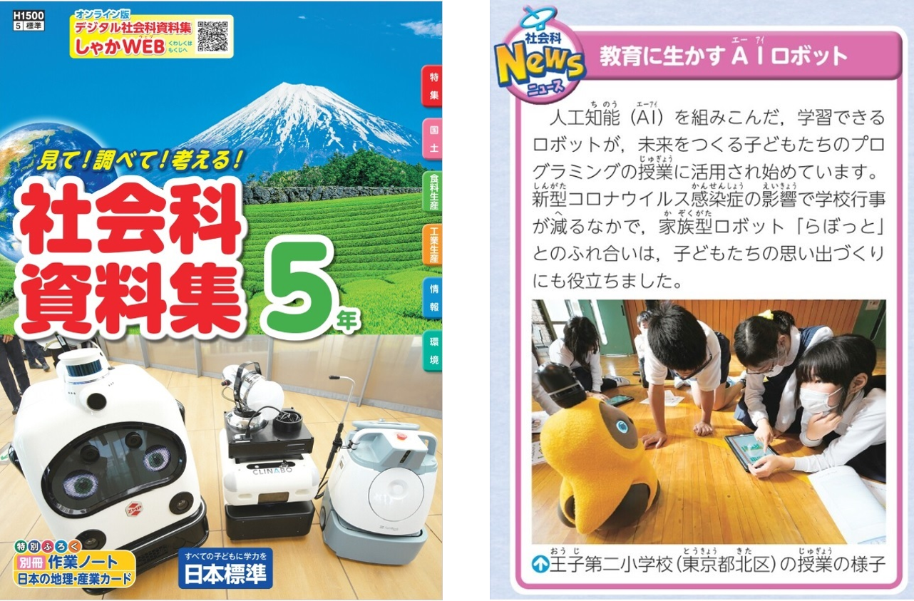 小学5年生が使用する社会科資料集のコラム『教育に生かすAIロボット』にて、小学校のプログラミング教育で活用された例として『LOVOT』が掲載されています。