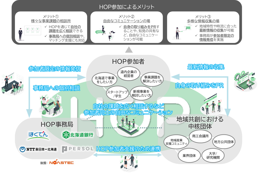 北海道のビジネスに携わる人々が広く繋がりを持つことができ、次のステップへ跳び上がっていける( “HOP”できる)プラットフォーム