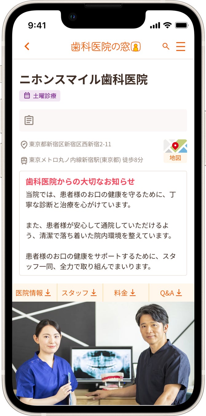 患者様は「インプラント」「歯科矯正」などの歯科医院の得意分野や「歯が痛い」「歯並びを良くしたい」といった症状に基づいて検索することができます。これにより、患者様の悩みを解決してくれる歯科医院を簡単に見つけることができます。