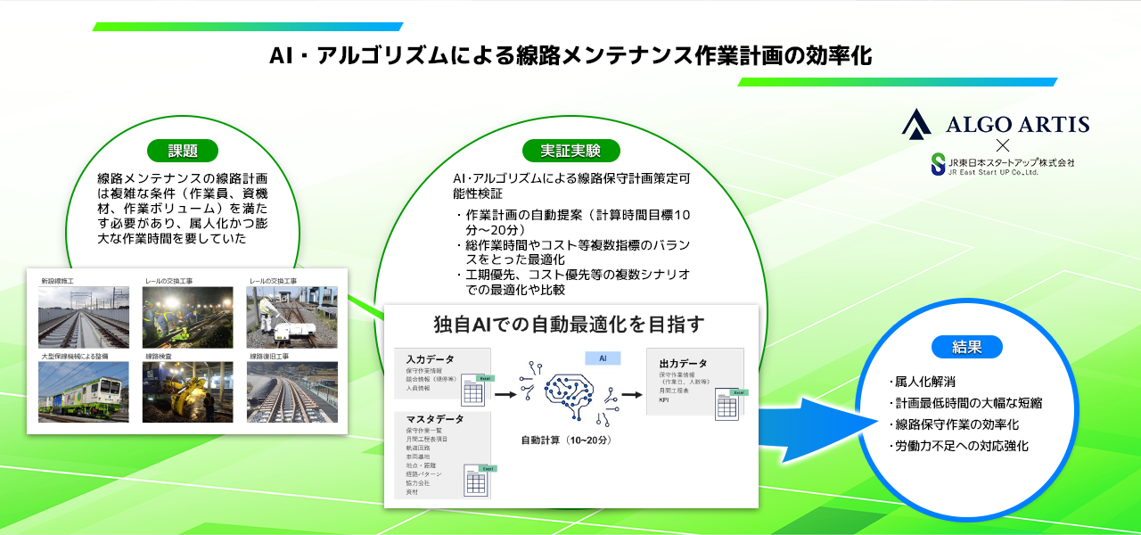 ALGO ARTISは、鉄道のような社会基盤を支える様々な産業の複雑で高度な運用計画を最適化するソリューション『Optium(オプティウム)』を開発・提供しております。本プログラムを通して、JR東日本グループのユニオン建設株式会社とともに、線路保守作業計画の最適化ソリューションの導入に向けたPoC(Proof of Concept)を進めてまいります。