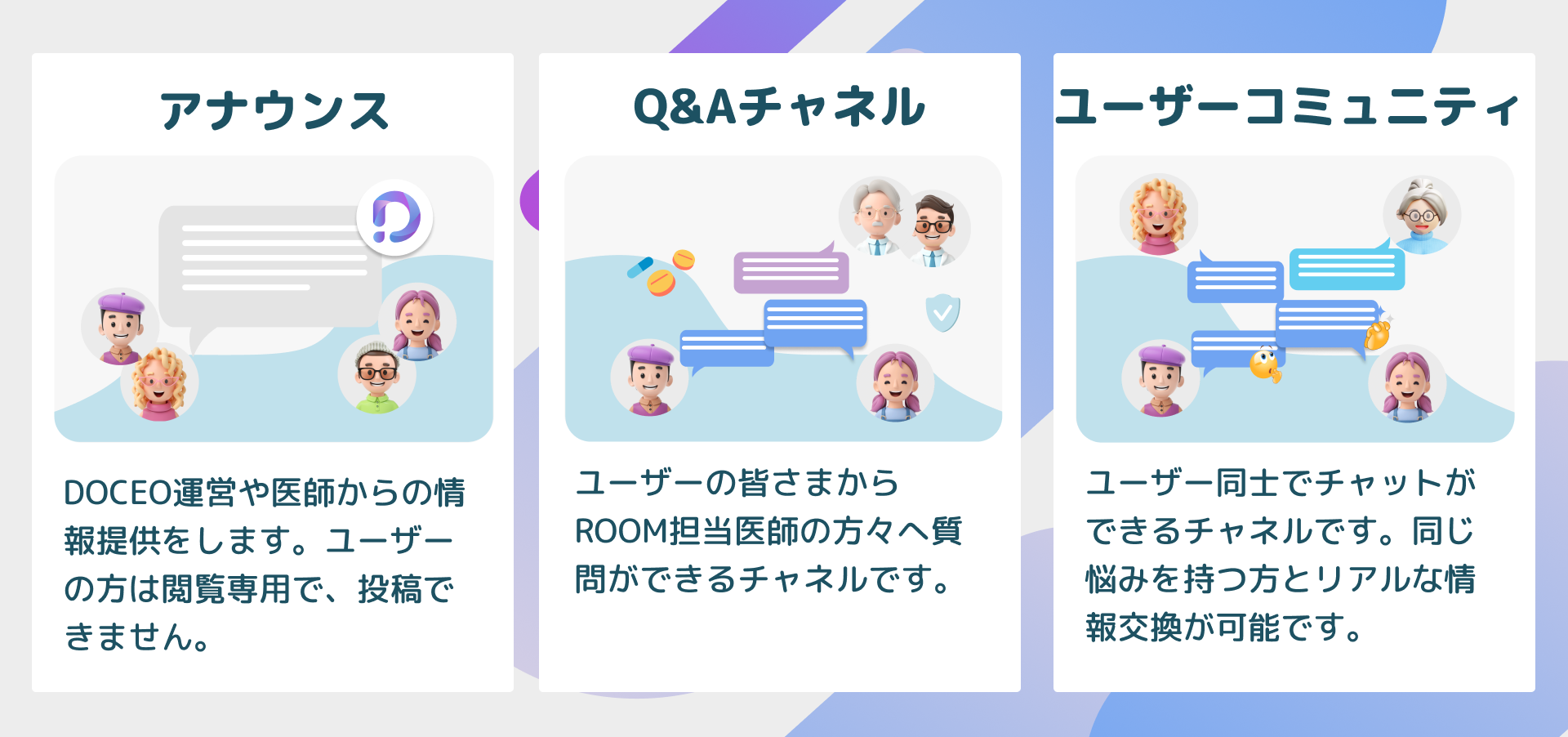 それらのROOMの中では、ROOM担当医師へのQ&AやROOMに所属するユーザーとのリアルな情報交換が可能です。今後はROOMから各種メディカルサービスとの連携を予定しており、ユーザーの皆さまがROOMより出会うことができた医師に対して具体的な行動に移すことが可能になります。