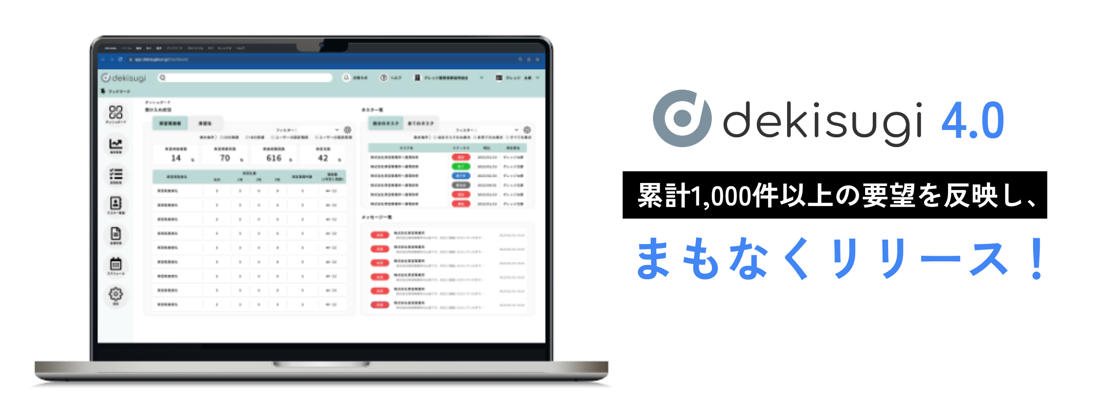 dekisugi 4.0と称し、外国人技能実習制度の変更(OTIT設置)当時から多くのお客様にご利用いただいた中で頂いた累計1,000を超えるご要望から、従来モデルでは搭載しきれなかったものを搭載して生まれ変わる、dekisugiチームの集大成ともいえるメジャーアップデートとなります。