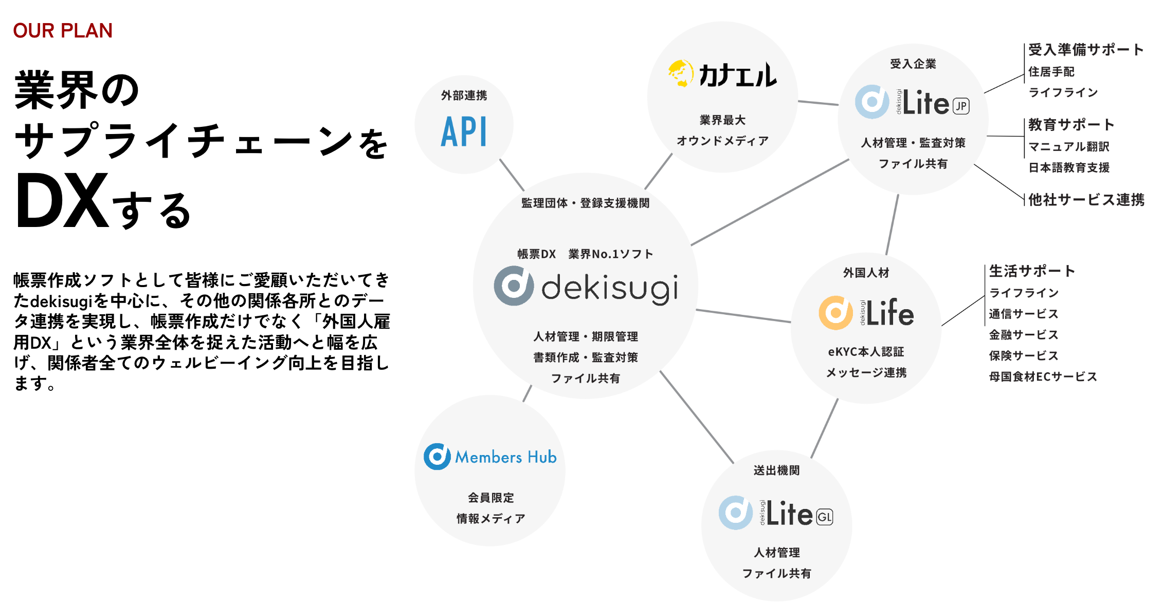 帳票作成ソフトとして皆様にご愛顧いただいてきたdekisugiのメジャーアップデートを中心に、支援団体と連携する関係各所に向けたソフトの提供・データ連携を実現し、帳票作成だけでなく「外国人雇用DX」という業界全体を捉えた活動へと幅を広げ、関係者全てのウェルビーイング向上を目指します。