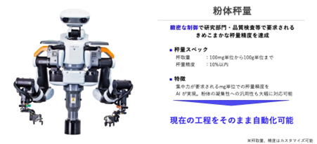 カワダロボティクスとエクサウィザーズで、製造業における粉体秤量工程の高速自動化を実現するために共同開発した「exaBase ロボティクス 粉体秤量 for NEXTAGE」を初めて一般向けに公開・展示します。