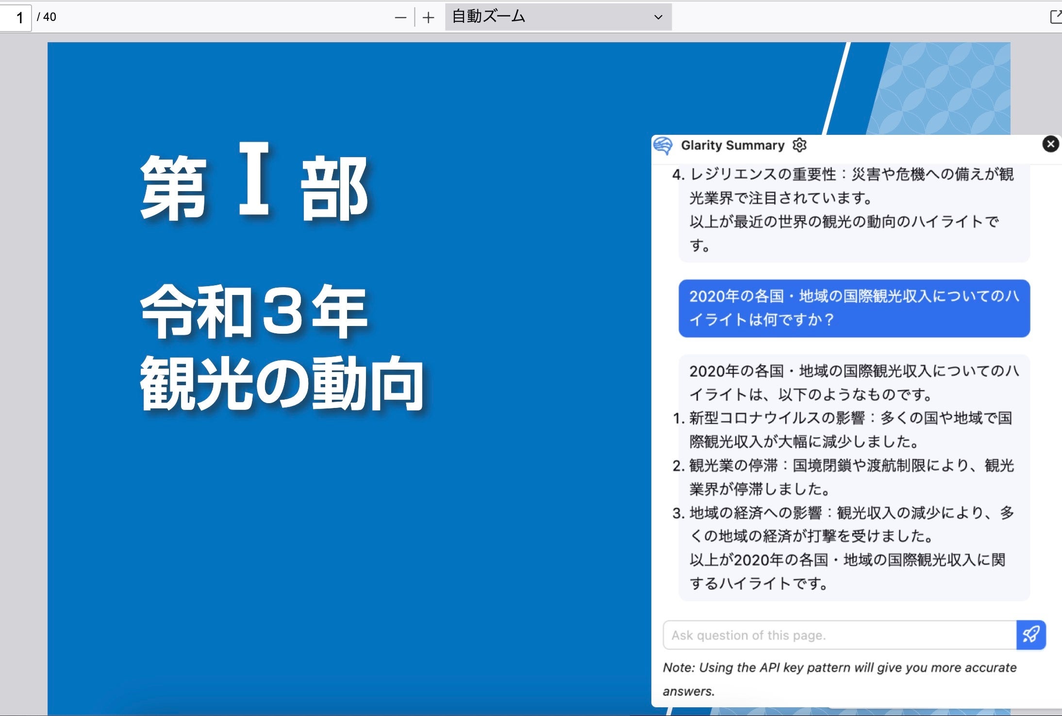 さらに、Glarity 2.0はオンライン情報の要約だけでなく、ローカルのPDFファイルにも対応しています。PDFファイルへの質問を通じて、情報の選別と要約の効率を向上させることができます。Glarityを活用することで、膨大な情報から効率的に必要なポイントを抽出し、集中して活用することができます。