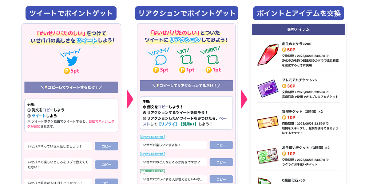 ユーザーはツイートしたり、該当のツイートにリプライすることでポイントを獲得できます。そして、貯めたポイントはゲーム内アイテムなどに交換できます。