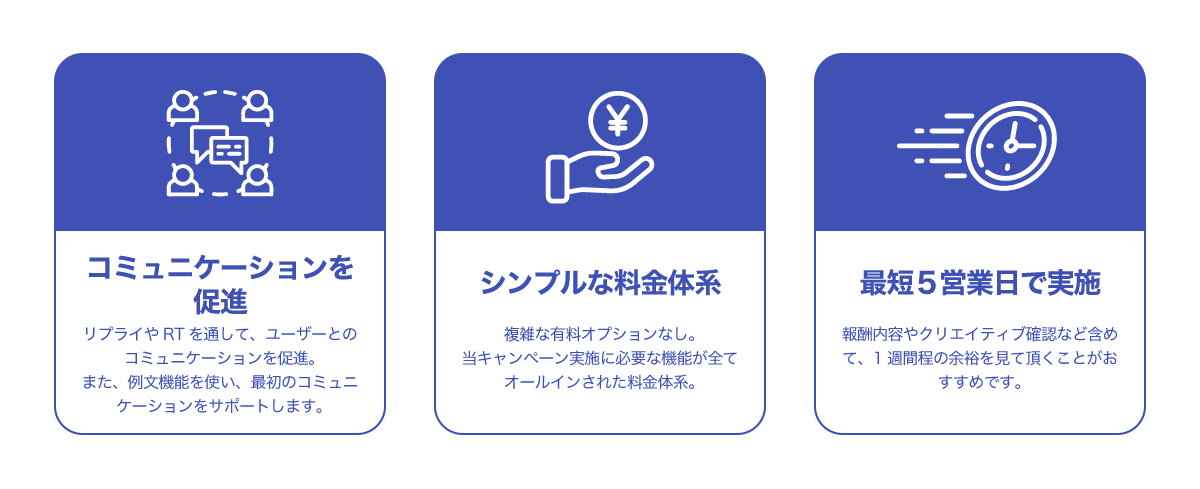 「SynCrew」は、Twitterユーザーのコミュニケーションを強化する新たなノーコードキャンペーンツールです。キャンペーン参加ユーザーがハッシュタグをつけてツイートし、そのハッシュタグのツイートに「リプライ」をすることで、コミュニケーションを促進します。