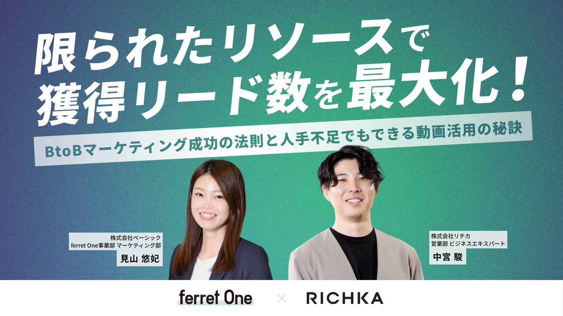 本セミナーでは、限られたリソースの中でリード獲得効率を最大化するべく、BtoBマーケティング領域のプロである『ferret One』においてマーケティングを担当する当社の見山が「施策運用の定石」について、リチカ社でビジネススペシャリストである中宮氏が「人手不足でも実践可能な動画運用の方程式」について、解説いたします。