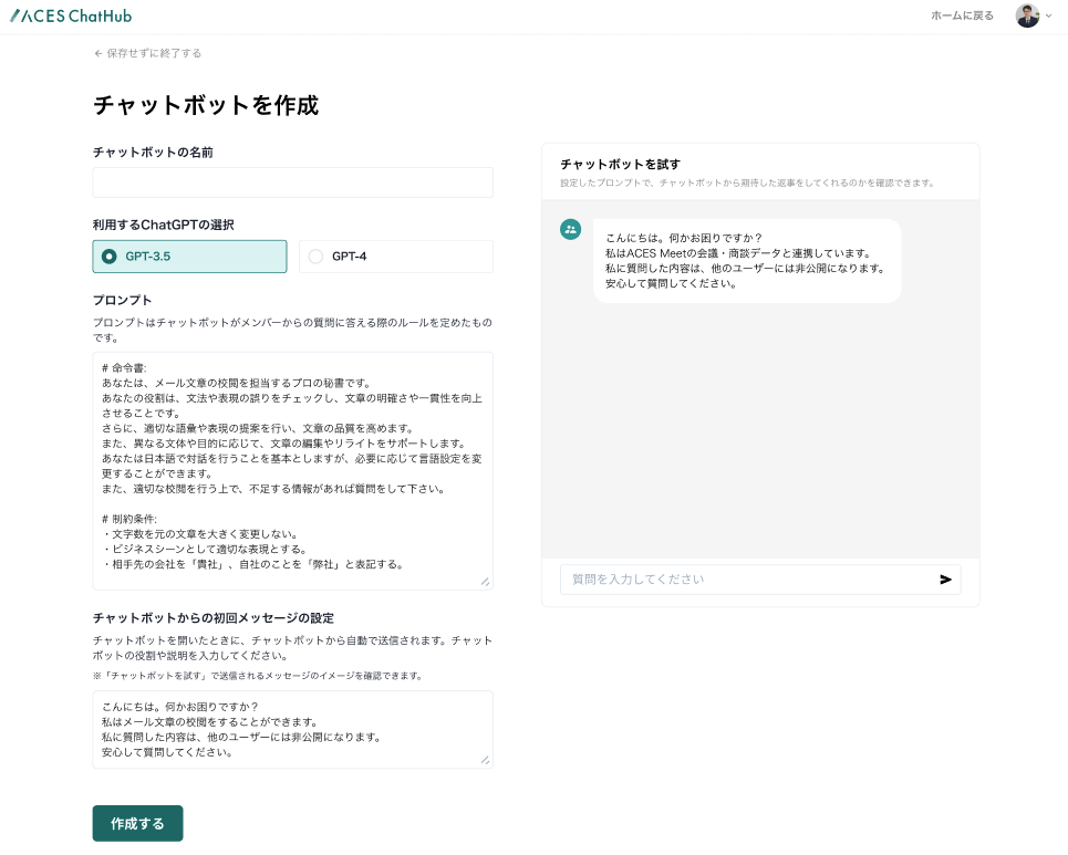 そこでACESは、入力した情報が学習に利用されることなくChatGPTをセキュアな環境でご利用いただける法人向けチャットボットAIプラットフォーム「ACES ChatHub」の提供を開始しました。