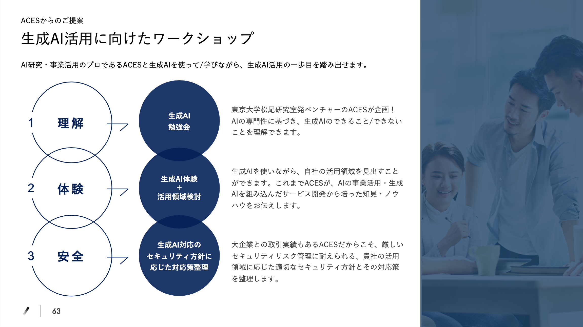 AIの研究開発と事業活用をリードする東大松尾研発ベンチャーであるACESは、かねてより幅広い産業のDX支援を通しヒトとAIが協働する業務のデザインを行っており、「ACES ChatHub」「ACES Meet」をはじめChatGPTを利用した複数のプロダクトを開発・提供しています。ChatGPTなどのオープンAPIのみでは実現できない社内情報や作業現場のデジタル化で培ったノウハウを活かし、様々な企業様のAI活用を後押しすべく、生成AIを体験し事業活用に向けた検討を行うワークショップ付きのプロジェクトも承っておりますので、詳しくは以下よりお問い合わせ下さい。