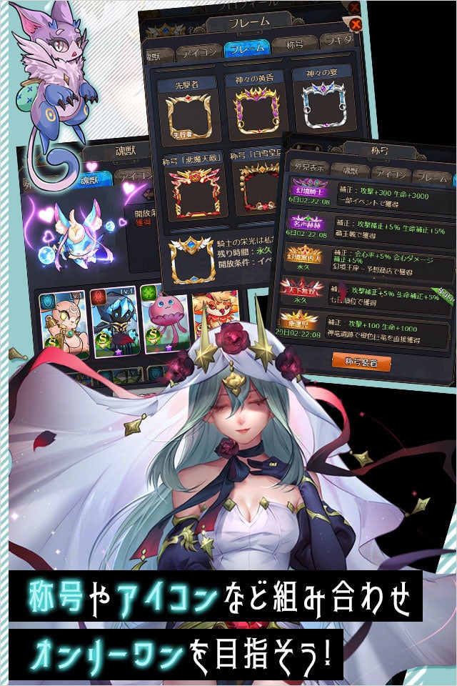 また、豊富な育成コンテンツもご用意しております。共に戦ってくれる100人以上の英雄の育成や進化はもちろん、専用武器や「聖器」といった強化コンテンツもあります。さらに、見た目が可愛い、ペットのような相棒も登場します。