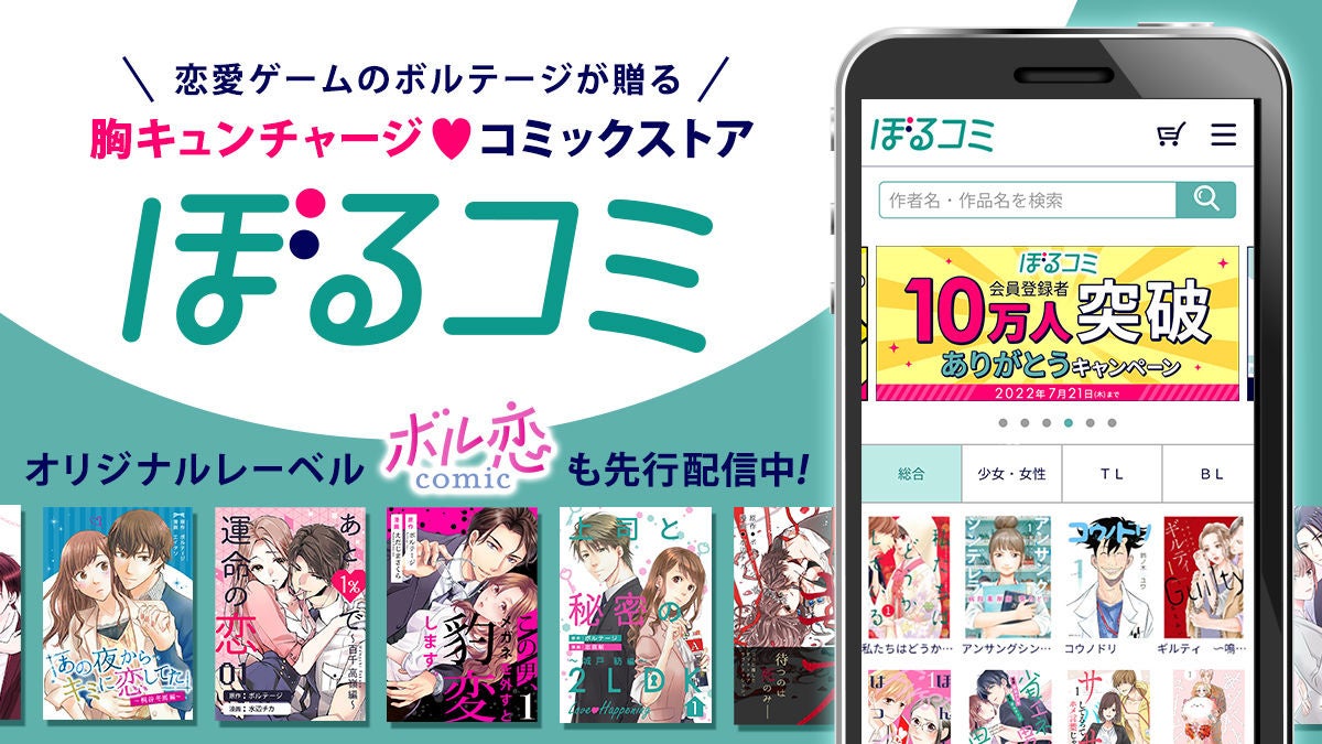 「ぼるコミ」は、延べ8000万人※の女性が楽しんだ恋愛ゲームを制作・運営するボルテージが、「胸キュンチャージ♡コミックストア」として、オリジナルレーベル「ボル恋comic」をはじめオトナ女子のみなさまにお楽しみいただける作品を、お得なクーポンとともに多数ご用意した電子コミックストアです。