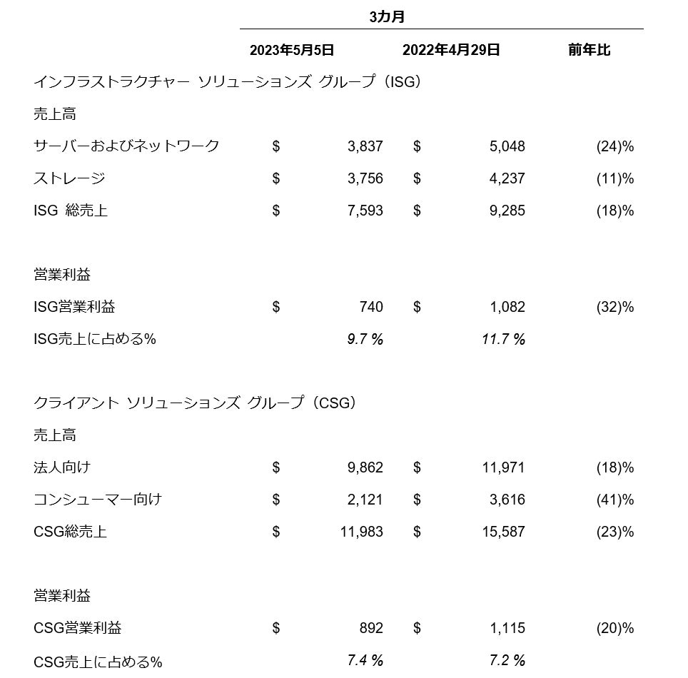 クライアント ソリューションズ グループ(以下、CSG)の第1四半期の売上高は、前年同期比23%減の120億ドルでした。法人向けPCの売上高は99億ドル、コンシューマー向けの売上高は21億ドルで、営業利益は同グループ売上の約7%となる8億9,200万ドルでした。