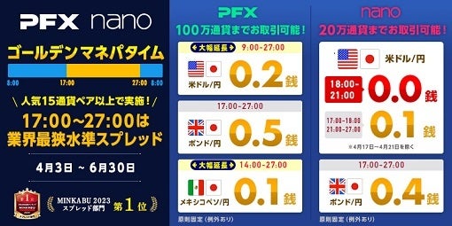 概要:17時~27時の時間帯(ゴールデンマネパタイム)は、『パートナーズFX・パートナーズFXnano』の全15通貨ペア以上を業界最狭水準スプレッドでお取引いただけるキャンペーンを引き続き実施いたしております。原則固定(例外あり)