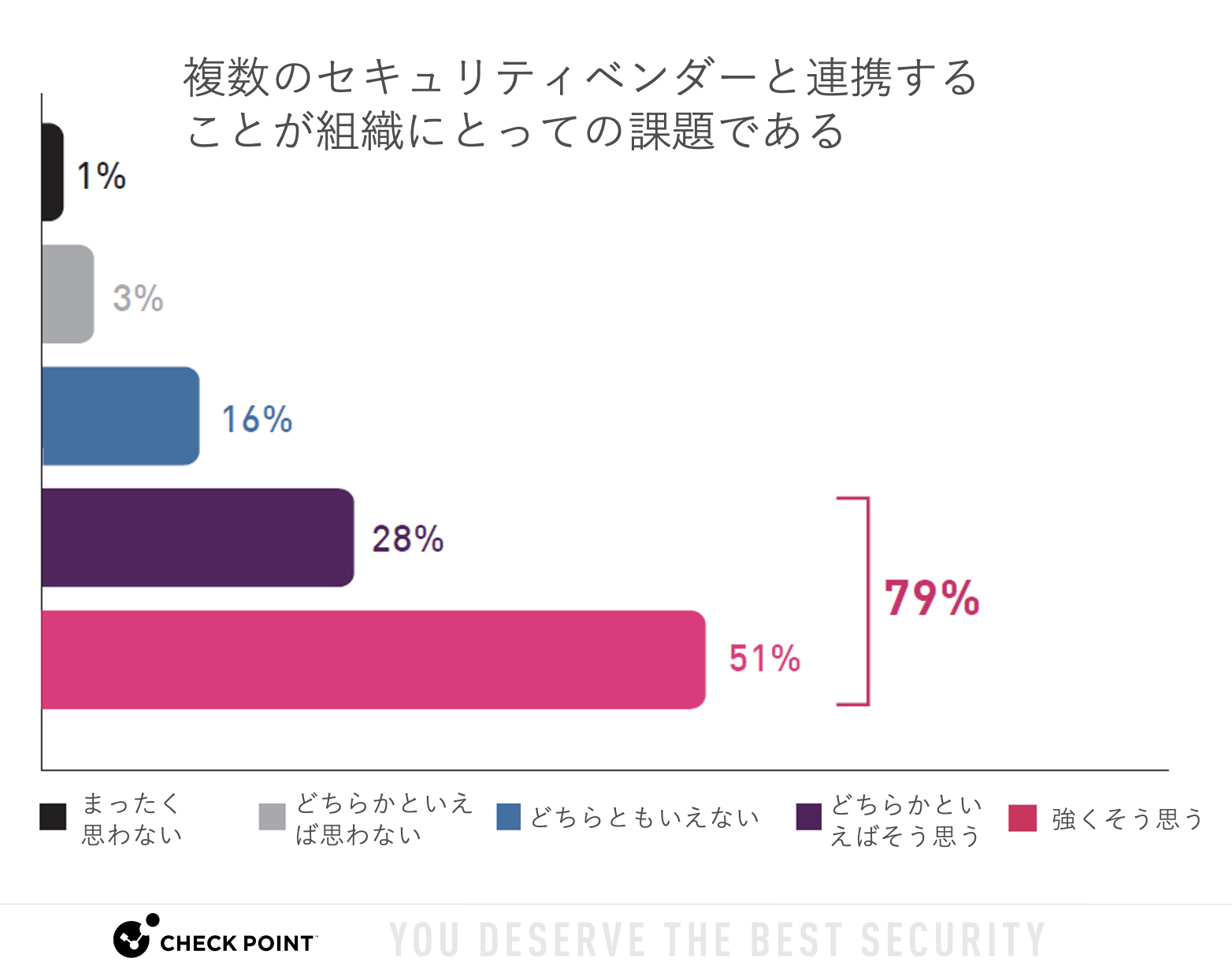 同様に、情報セキュリティ最高責任者(CISO)は、コロナ禍でセキュリティポリシーとセキュリティ インフラストラクチャを強化することで、拡大する攻撃対象領域に対応する必要がありました。情報セキュリティ最高責任者には、拡大する攻撃対象領域に対応するにあたって、2つの選択肢があります。1つは、複数のベンダーによってセキュリティ・アーキテクチャを継ぎはぎし、最善の戦略をとる選択肢、もう1つは、サイバー・セキュリティ・スイートでセキュリティ アーキテクチャを統合する選択肢です。複数のベンダーを利用する際に生じる設定ミスやセキュリティ・ポリシーの重複に関連するギャップを解消することができるため、後者のアプローチが推奨されます。チェック・ポイントが、この傾向を確認するために400人を超える世界の情報セキュリティ最高責任者を調査したところ、79%のセキュリティ専門家が「複数のセキュリティベンダーと連携することは困難」と回答し、69%が「連携するベンダーが少ないほどセキュリティが向上する」ということに同意しました。