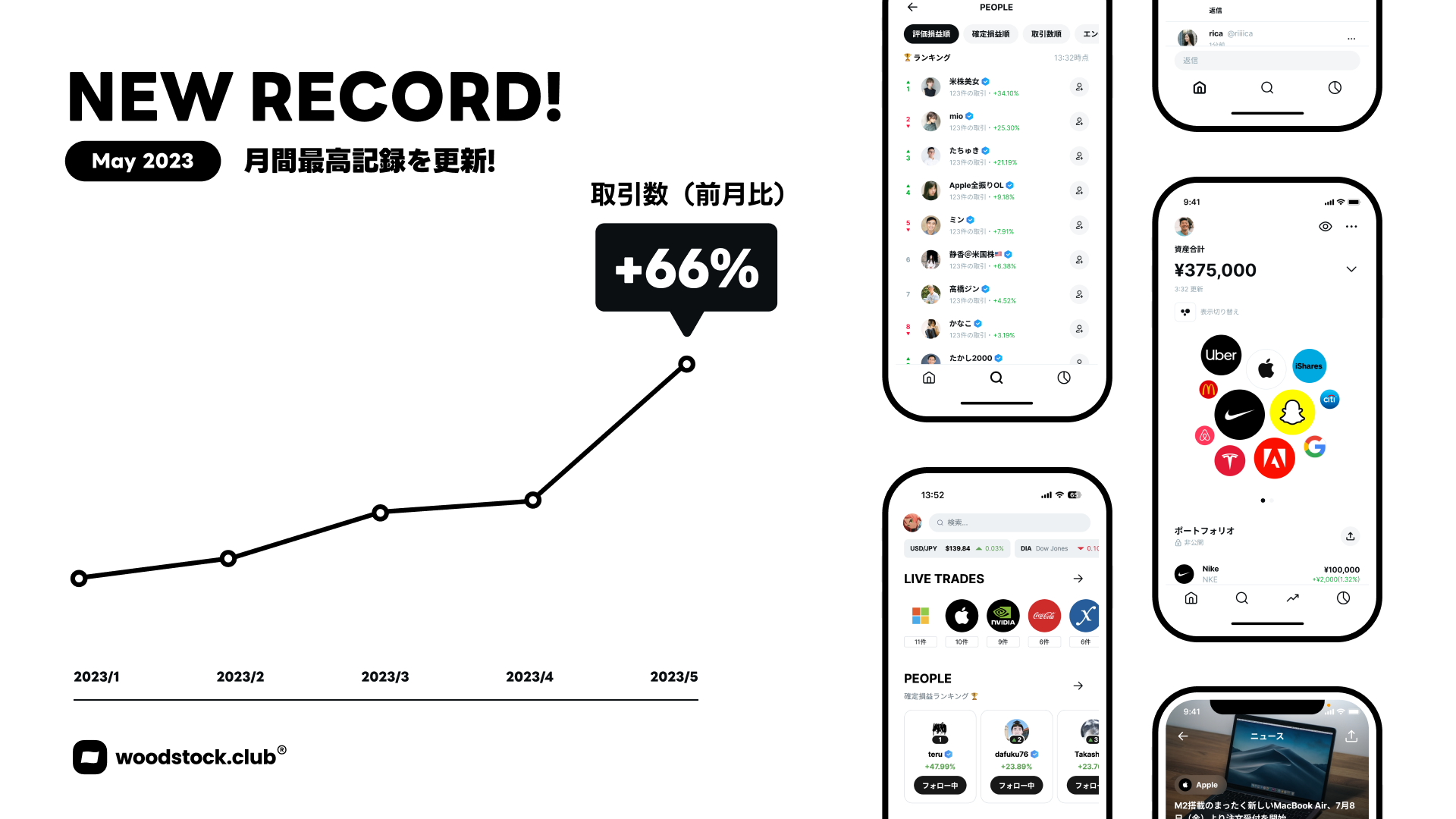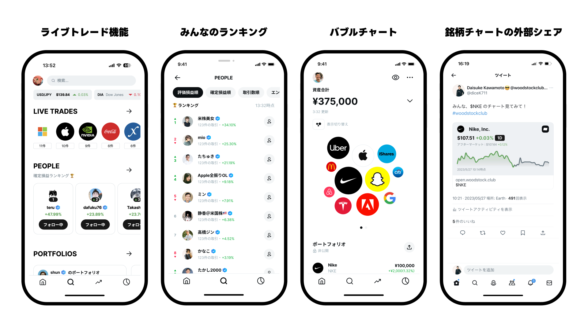 woodstock.clubは、米国株売買のみならず、会話や実際のポートフォリオシェアなどコミュニティとの交流を通じて、初心者も上級者も楽しんでいただける全く新しいSNS型投資アプリです。米アクセラレーターY Combinatorにも採択されたAlpacaとのパートナーシップにより米国マーケットへのアクセスを可能にし、日本初、560銘柄以上の米国株式やETFを、日本円で1000円からリアルタイムで売買できます。また、自分の保有している銘柄やポートフォリオを他の人にシェアしたり、他のユーザーのポートフォリオを参考に投資戦略を練るなど、ソーシャルを通じた情報交換によって全く新しい投資体験をしていただけます。