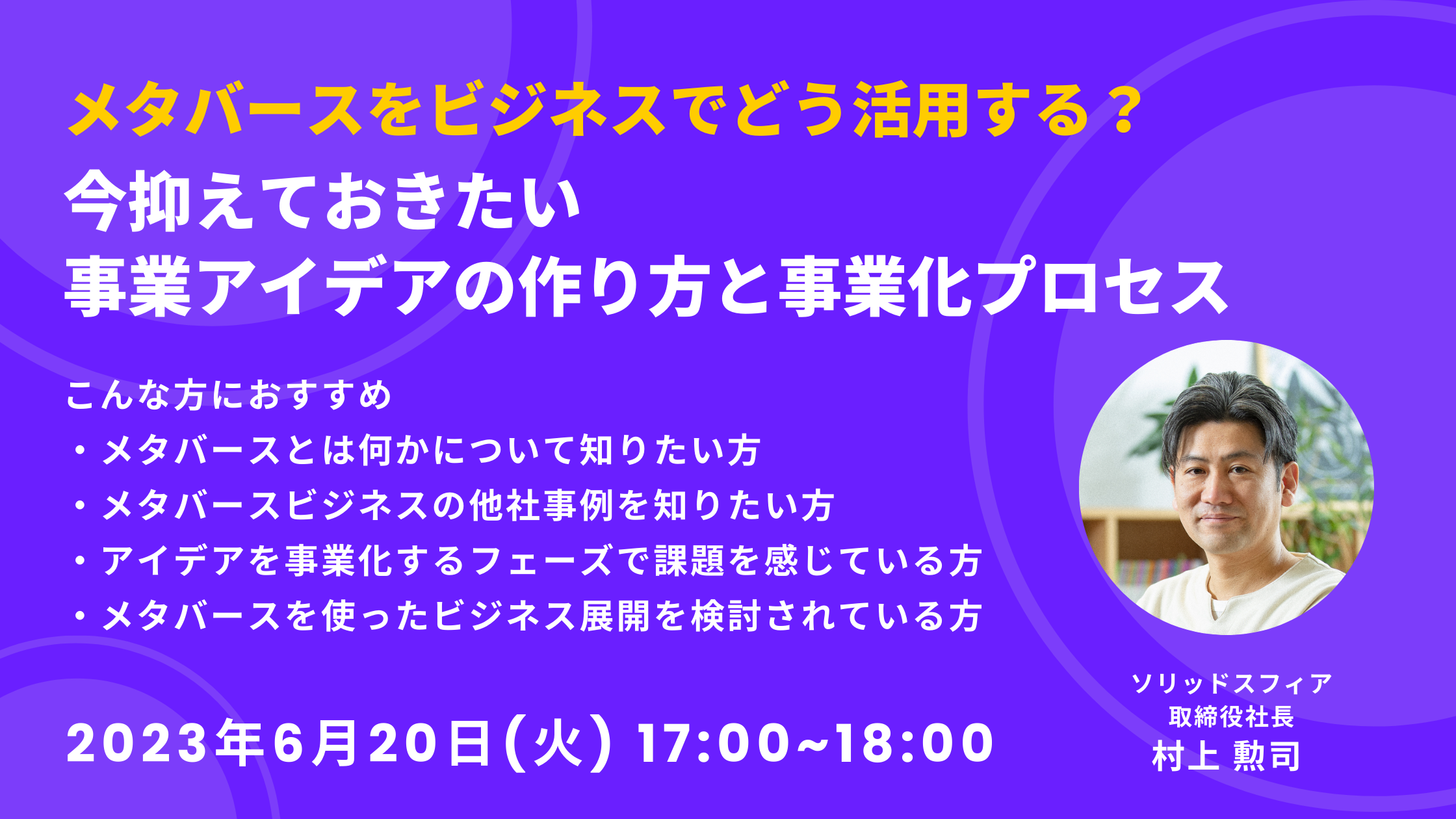 一方で、メタバースをビジネスでどのように活用できるのか、どのようなUX設計にすべきか、あるいは、そもそもどんなプラットフォームが提供されているのかなど、分からないことが多く、活用してみたいが躊躇している方も多くいらっしゃるのではないでしょうか。本セミナーでは、そのような悩みをもつ企業様向けに、メタバースのビジネス活用における事業アイデアの作り方と事業化プロセスについて事例を交えてお話しさせていただきます。