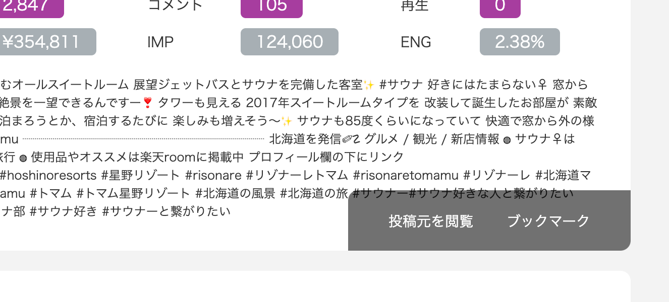 ブックマークされたものだけで集計をする事が可能なため、依頼したインフルエンサーだけの効果測定などにも活用いただけます