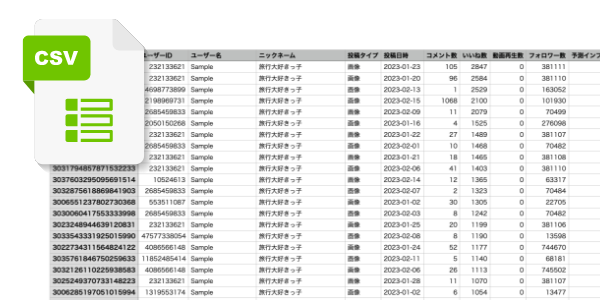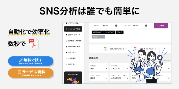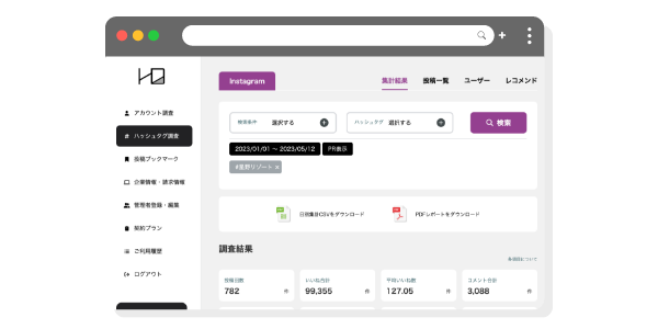 ハッシュタグ調査(投稿回数・いいね数・平均値・投稿一覧・投稿ユーザー一覧など)