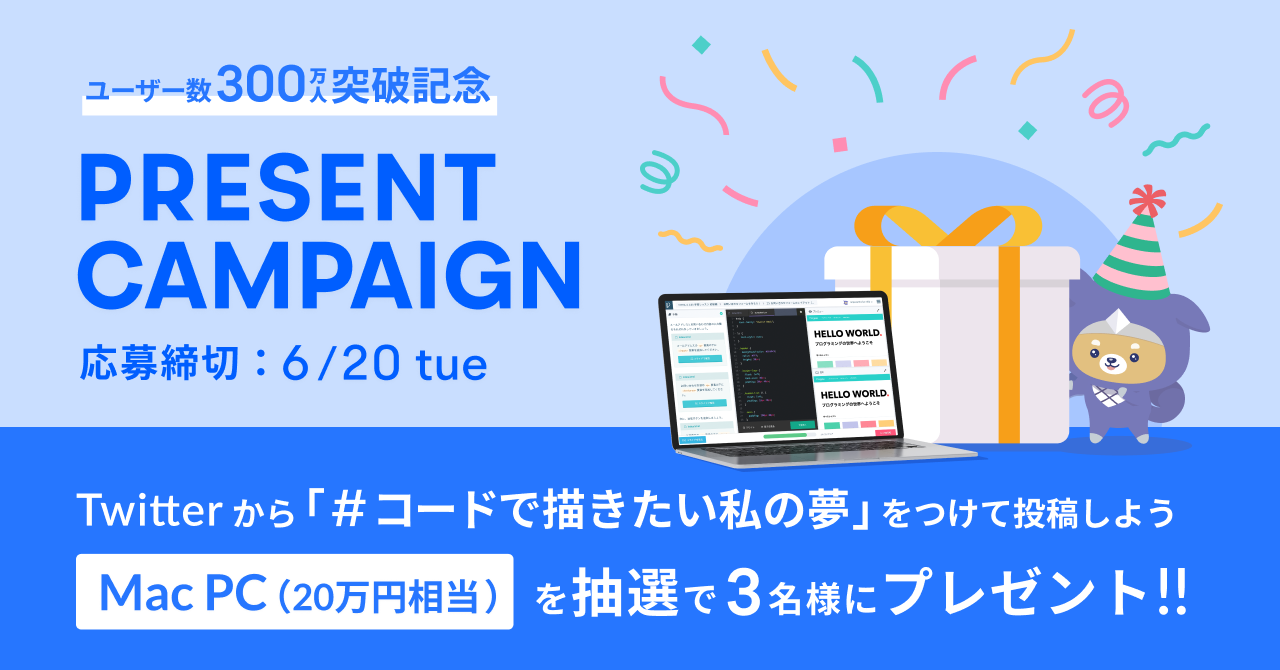 ユーザー数300万人突破を記念して、『プログラミングを学んで実現したい、あなたの夢を教えて!』というテーマでTwitterでの投稿を募り、参加いただいた方の中から3名の方に『Mac Book Pro』をプレゼントいたします。