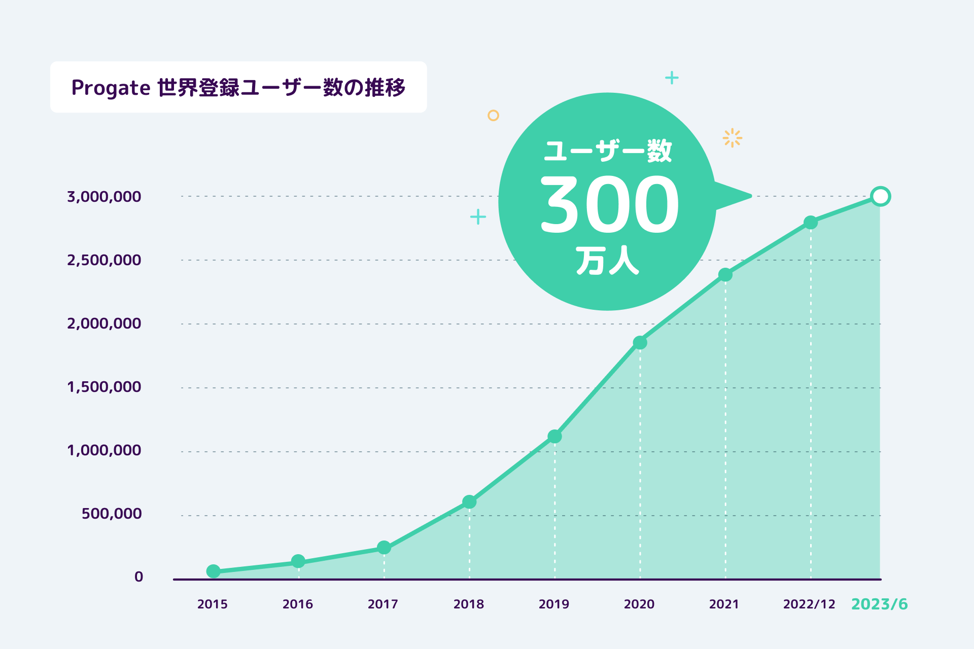 2014年7月設立以降、オンラインプログラミング学習「Progate」は「プログラミング学習の入り口」と評価していただき、2023年6月、ユーザー数は全世界で300万人に達しました。