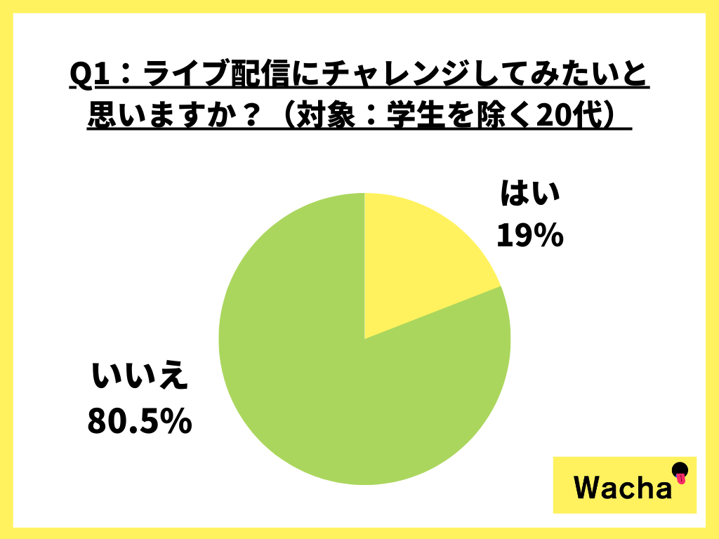Q1. 「ライブ配信にチャレンジしてみたいと思いますか?」という質問では「はい」と回答した人が19.5%、「いいえ」と回答した人が80.5%という結果でした。ライブ配信市場は成長している中、視聴している人は多いが、実際に配信する側の母数はまだまだ低いことが予想されます。実際、既存のライブ配信では、タレントやモデル、アスリートや専門家など、知名度のある人が配信しているケースが多いようです。