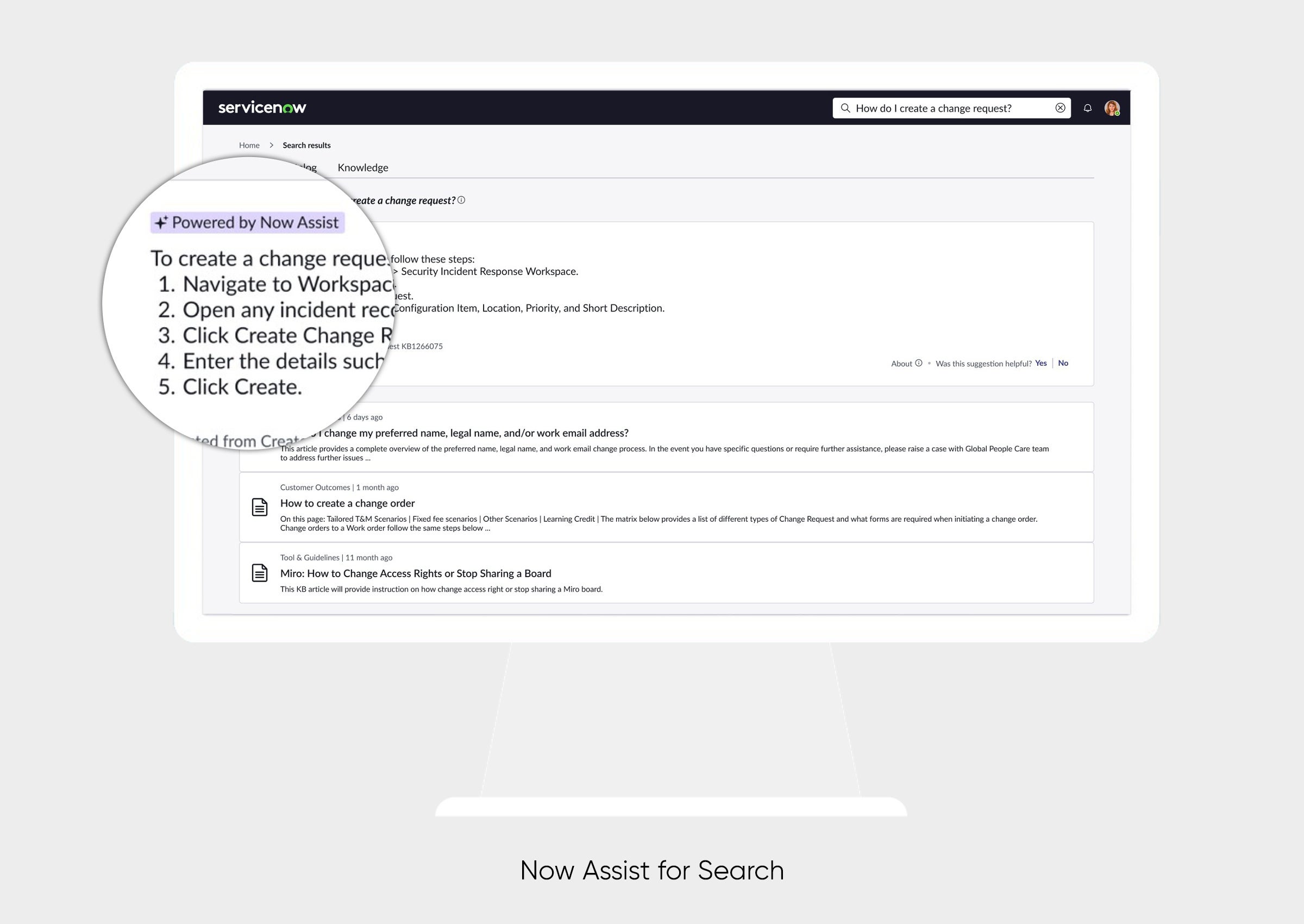 Now Assist for SearchはPortal Search、Next Experience、仮想エージェントにおいてユーザーからの質問に対して顧客自身のナレッジベースに基づいた自然な言語での回答を提供します。顧客の環境内から情報を引き出すため、Now Assist for Searchでは強固なセキュリティレイヤーが適用され、より正確な結果が得られる安心感があり、エラーやハルシネーション(AIの幻覚)を大幅に低減します。