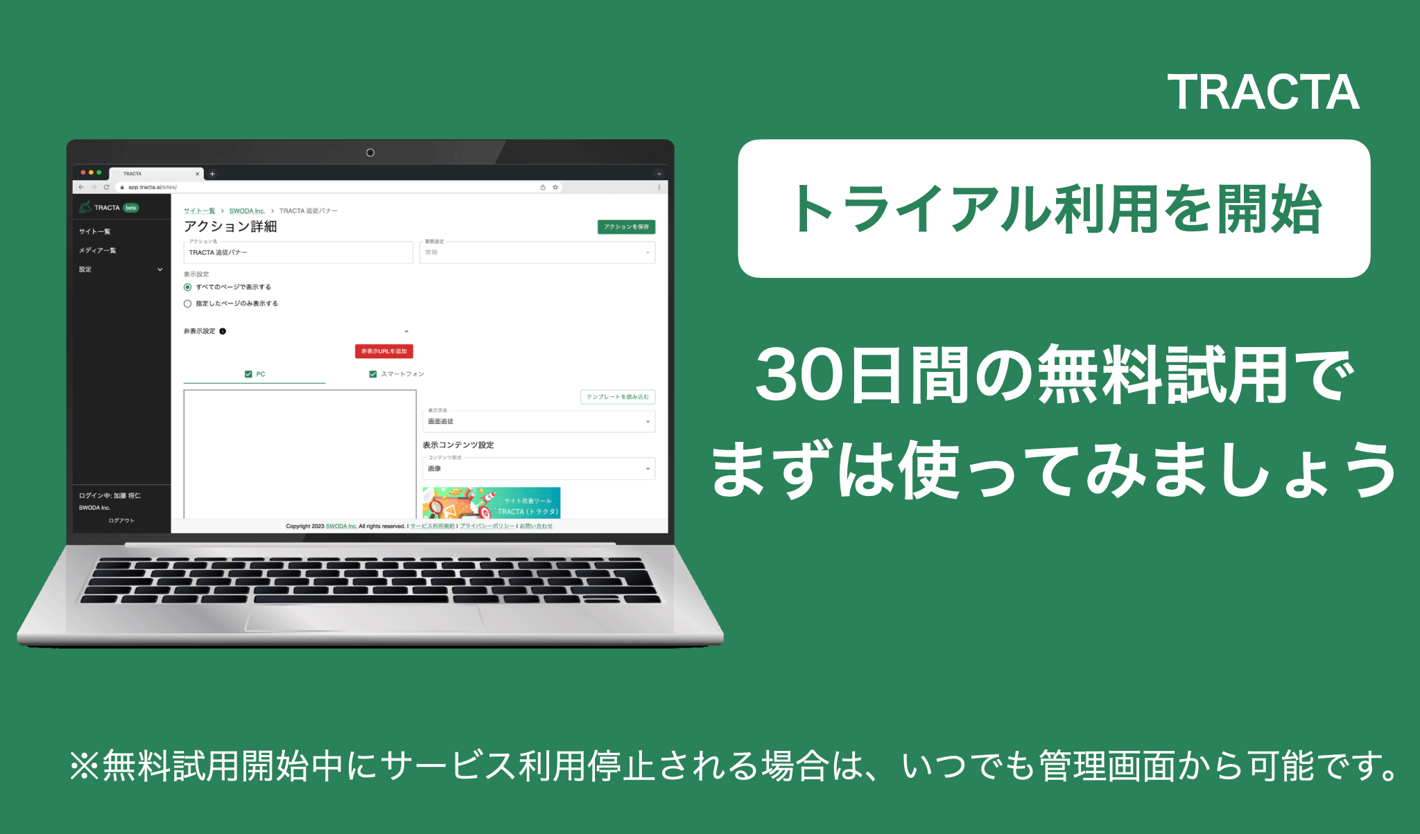 ※プランをキャンセルしなかった場合は、無料試用期間の終了後にご選択いただいたプランの料金が発生した上でTRACTAをそのままの設定でご利用いただくことができます。(追加で必要な設定等はございません)