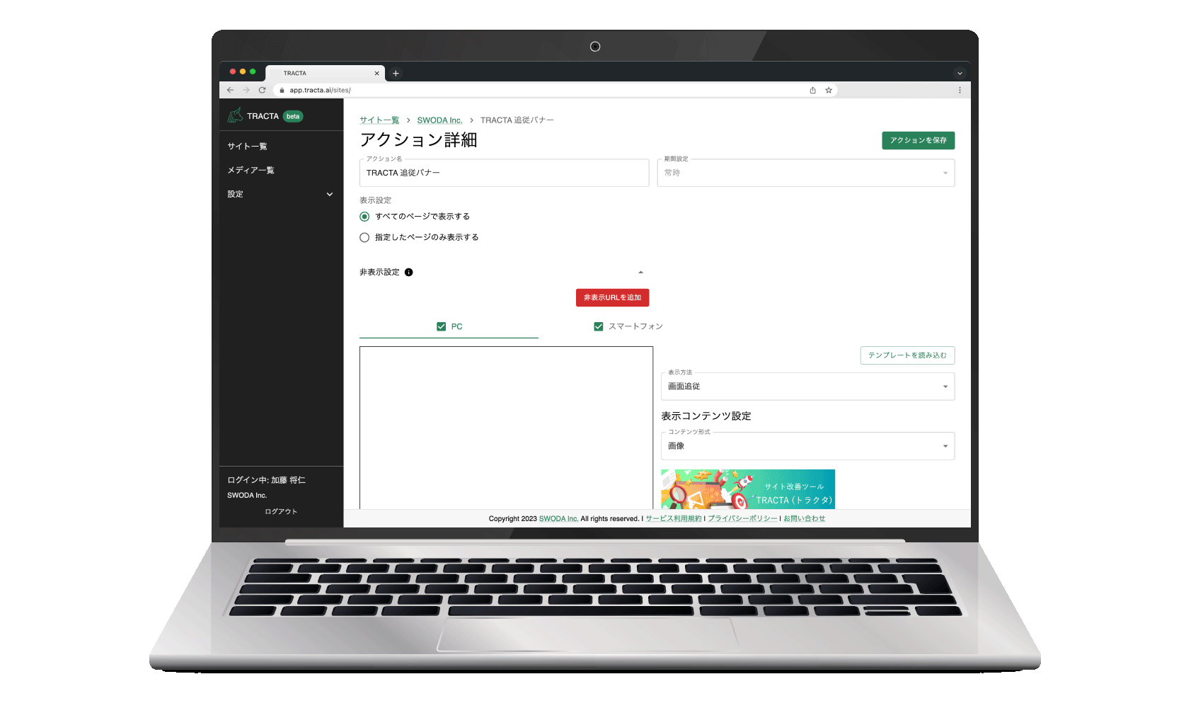 プログラミングの知識がなくても、ウェブサイトへ追従バナーやポップアップなどのアクション導線(CTA)を自由に設置して、各企業のマーケティングの担当者がご自身でウェブサイトのコンバージョン改善などを進めることができるようにした、ノーコードのアクション設置型マーケティングツールです。