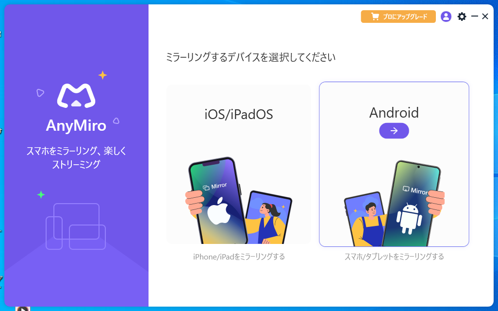 AnyMiroをPCまたはMacにインストールして起動します。ミラーリングするデバイスを選択します。ここでは、Androidデバイスを例に使い方を紹介します。