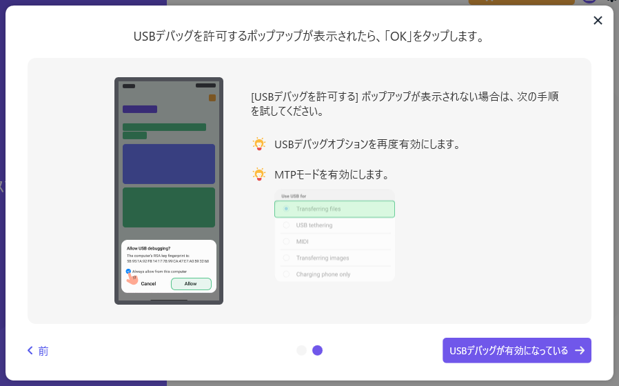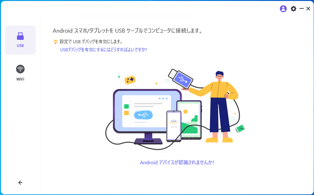 Android デバイスに AnyMiro アプリをインストールして起動します。ケーブルまたは無線でパソコンと接続します。ここではUSBケーブルの接続方法を例にして説明します。