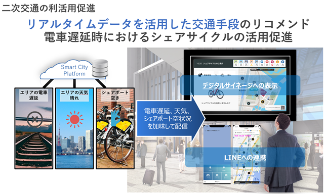 そこで、東急不動産とソフトバンクは、回遊性の向上に向けた取り組みとして、移動手段が不足している竹芝地区でシェアサイクル「HELLO CYCLING」を提供するOpenStreet株式会社などのシェアモビリティ事業者のデータと連携し、竹芝エリアマネジメントの「竹芝公式LINE」や東京ポートシティ竹芝のデジタルサイネージに満空情報を表示するなどの取り組みを進めています。「LINE」やデジタルサイネージなどで交通手段に関する情報を簡単に確認できることで、異なる交通手段の利用を促進するとともに、竹芝地区の回遊性の向上につながることを目指しています。